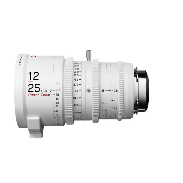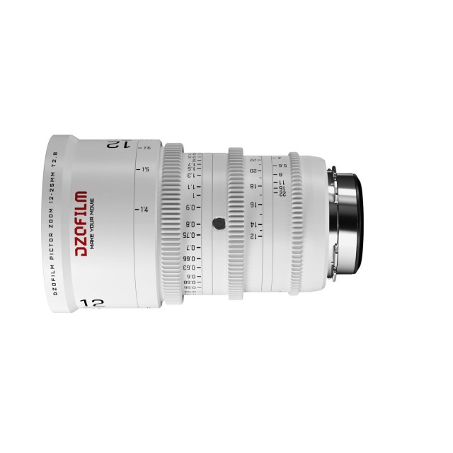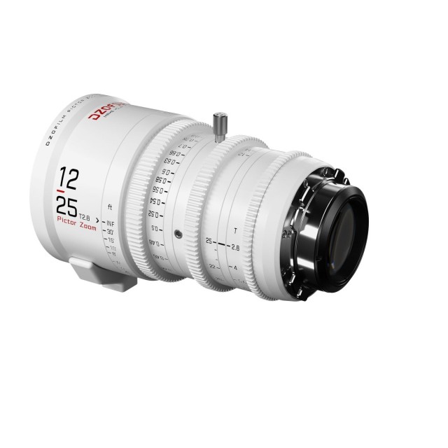 DZO Pictor 12-25mm T2.8 parfocal film objektiv pokriva Super 35 / APS-C format senzora, nudi T2.8 otvor blende u cijelom rasponu žarišnih duljina i dolazi uklj. izmjenjivi PL i EF bajuneti. Konstrukcija leće praktički eliminira disanje i jamči oštar crtež cijelom površinom kao i lijep prikaz scene izvan dubinske oštrine zahvaljujući dijafragmi koja se sastoji od 16 lamela. Naravno, tu su i prstenovi zupčanika za fokus, otvor blende i zumiranje za jednostavno daljinsko upravljanje pomoću sustava za bočno fokusiranje (M0.8; hod prstena za fokus 270°). Prednji promjer je standardnih 95 mm za uobičajene kompendije, navoj filtera je 86 mm. Tu je i stopa za podupiranje objektiva unutar nosača. Težina cca 1600 g. Za PL i EF bajunete.