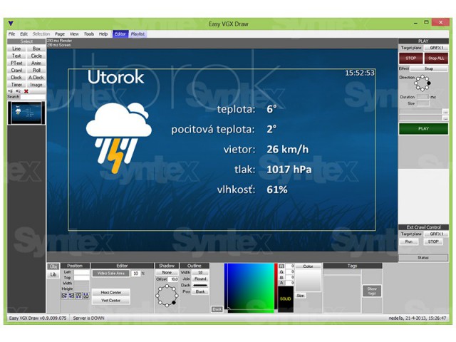 Prilikom izrade tekstova ili cijelih odlomaka moguće je koristiti font instaliran izravno u operativnom sustavu. Ako imate istočnoeuropske TrueType fontove s dijakritičkim znakovima, CG će ih prikazati bez problema. Možete umetnuti tekstualne informacije u CG izravno u odjeljku Dizajner ili ih možete dobiti iz vanjskih izvora - tekstualne datoteke, imenika, XML-a ili RSS-a. Samo postavite osnovne parametre kao što su položaj teksta, font, veličina, poravnanje, boja, prozirnost i drugi parametri i CG aplikacija će preuzeti stvarni sadržaj iz izvora.