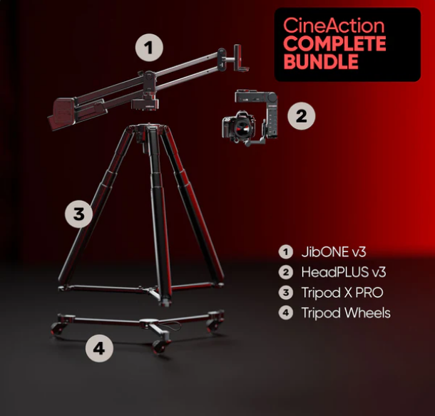 Edelkrone CineAction Bundle - Complete kombinira JibONE v3, HeadPLUS v3, Tripod X PRO i kotače za tripod, nudeći sve-u-jednom rješenje za glatke kinematografske snimke profesionalne razine s preciznom kontrolom pokreta.