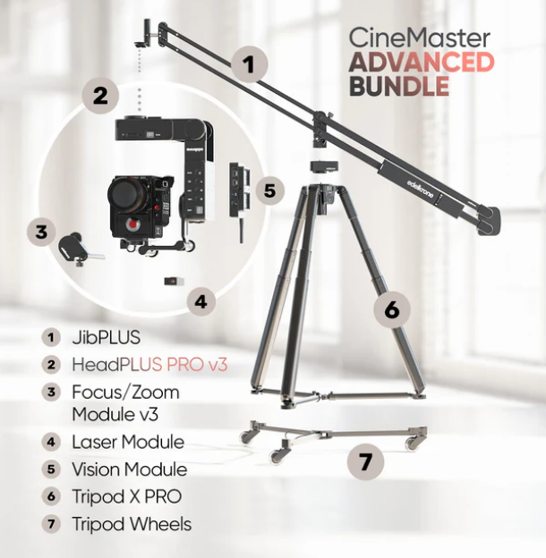 Edelkrone CineMaster Advanced Bundle donosi sve-u-jednom kinematografsko rješenje s JibPLUS , HeadPLUS PRO v3 i osnovnim dodacima, što omogućuje profesionalnu, motoriziranu kontrolu pokreta kamere, savršenu za stvaranje složenih snimaka i preciznu kontrolu u vrhunskoj video produkciji.