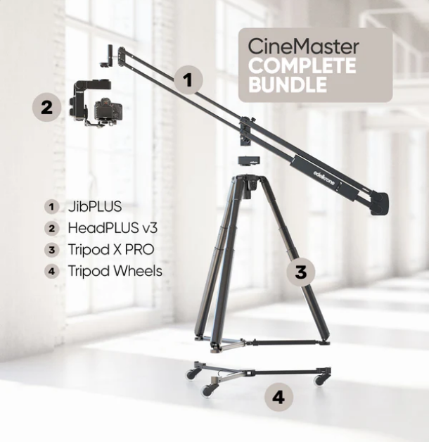 Edelkrone CineMaster Bundle - Complete uključuje JibPLUS, HeadPLUS v3, Tripod X PRO i kotače za tripod, pružajući sveobuhvatan sustav kontrole kretanja za stvaranje glatkih i preciznih kinematografskih snimaka.