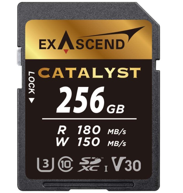 SDXC UHS-I kartice serije Exascend Catalyst nude profesionalcima u području profesionalne fotografije i kinematografije dovoljne performanse za snimanje filmova i sekvencijalno fotografiranje u visokim rezolucijama i brzini kadrova. Model od 256 GB nudi maksimalnu kontinuiranu brzinu čitanja od 180 MB/s, maksimalnu sekvencijalnu brzinu pisanja od 150 MB/s; kartica ima V30 certifikat, jamče minimalnu brzinu pisanja veću od 30 MB/s.
