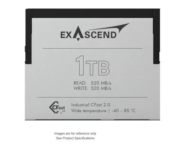 Exascend 512GB CFast 2.0 kartica (SD3X serija) pruža kontinuirane brzine čitanja od 520 MB/s i pisanja od 400 MB/s putem SATA III s 3D TLC NAND-om. Radi na 3,3 V od -40°C do +85°C, dimenzije su joj 42,8 x 36,4 x 3,6 mm i idealna je za industrijski 4K/8K video, nadzor i ugrađene sustave velikog kapaciteta.