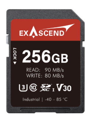 Exascend EX256GSDV30-IDE je industrijska SDXC kartica (serija SD300) od 256 GB s brzinama čitanja do 90 MB/s i pisanja do 80 MB/s. Oznake V30/U3/C10/A2 omogućuju rad od -40°C do +85°C s MTBF-om od 2.000.000 sati, ulaznim naponom od 2,7–3,6 V i SMART nadzorom – idealna za robusni 4K nadzor, ugrađene sustave i industrijsku automatizaciju.