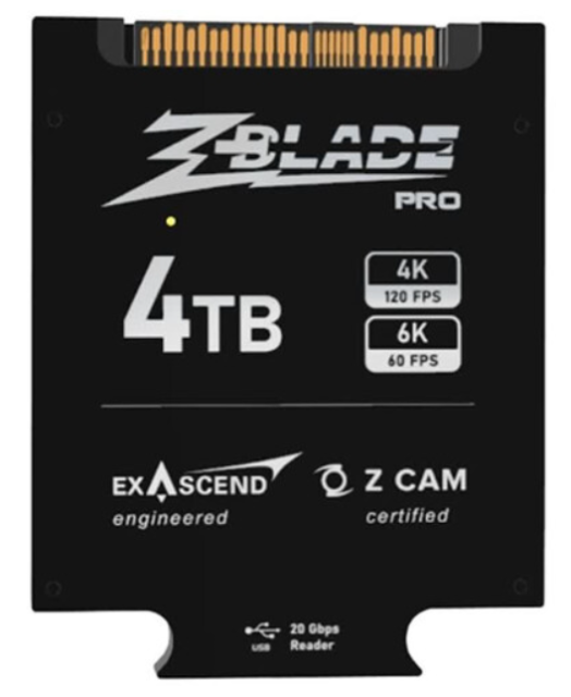 Exascend EXP4M6G004TB ZBlade Gen4 je modul za pohranu velikog kapaciteta od 4 TB, posebno razvijen sa Z CAM-om za E2-F6 Pro full-frame 6K kino kameru, koji služi kao službena medijska platforma za besprijekorno snimanje s točnošću kadrova. Postižući brzine čitanja do 2400 MB/s i pisanja od 1400 MB/s, podržava ProRes video u 4K120 ili 6K60 bez padova, a pokreće ga 3D TLC bljeskalica. Njegovo integrirano 20 Gbps USB-C 3.2 Gen 2 sučelje omogućuje izravan prijenos do 20 GB/s, zaobilazeći vanjske čitače za učinkovite tijekove rada. Robusno je konstruiran za profesionalno snimanje, podnosi udarce do 50G, radi od 0°C do 70°C i ima izdržljivost od 4000 TBW s niskom potrošnjom energije (<5W aktivno). 5-godišnje jamstvo s besplatnim oporavkom podataka osigurava pouzdanost u zahtjevnim snimanjima.