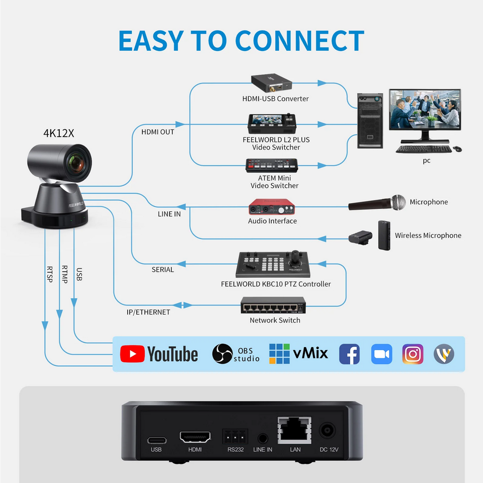 1.Multi-cam: Možete koristiti dva 4K12X za srednji live streaming i tri 4K12X za veliki live streaming. Koristite s FEELWORLD L2 PLUS video switcherom, možete ga pratiti u stvarnom vremenu i povezati računalo za reprodukciju PPT.