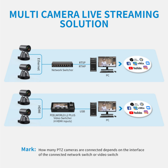 Za srednje ili velike prijenose uživo uvijek je potrebno snimanje s više kamera kako bi se dobili različiti pogledi. Možete jednostavno povezati više PTZ kamera putem mrežnog prekidača ili video switchera.