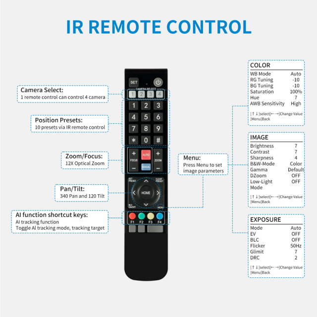 10 unaprijed postavljenih položaja pomoću IR daljinskog upravljača, koji može spremiti postavke pomicanja, nagiba i zumiranja i glatko prelaziti između njih pritiskom na gumb. Do 255 unaprijed postavljenih položaja putem mrežne kontrole ili kontrolera tipkovnice.