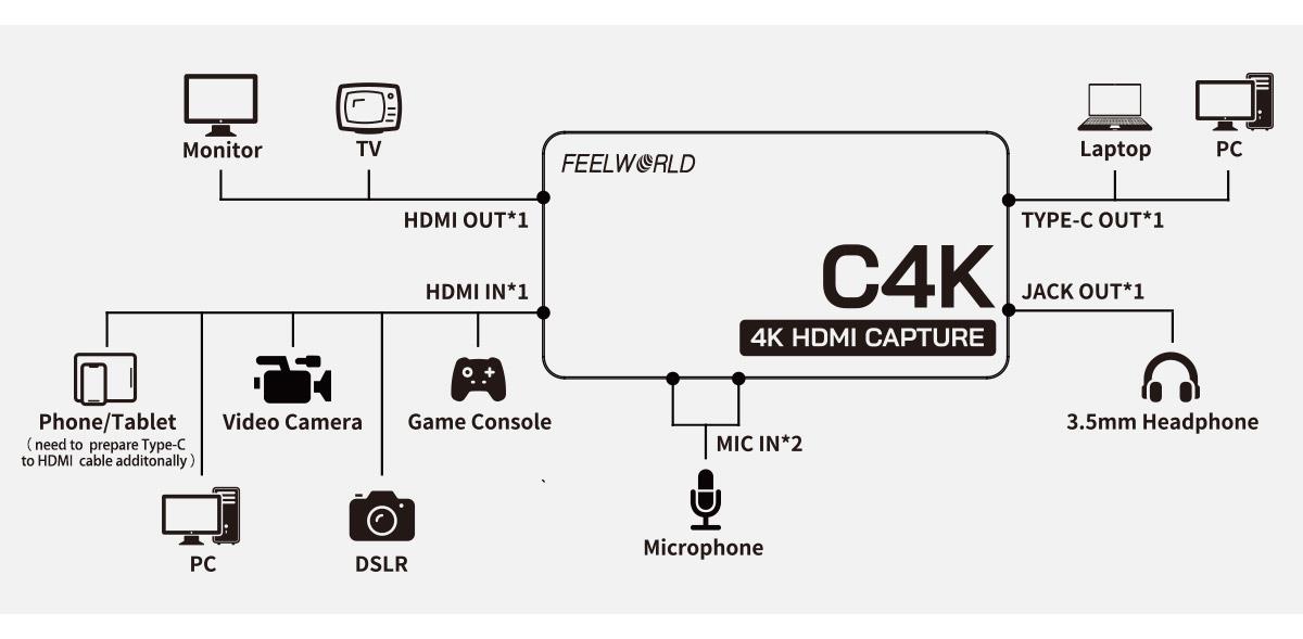 Kada se suočite s neugodnom situacijom nejasnoće, odstupanja boja i duge latencije tijekom prijenosa uživo, FEELWORLD C4K vam može pomoći u rješavanju tih problema. Opremljen je 4K HDMI ulazom i loop-outom, podržava više formata snimanja i može snimati do 4K 60Hz, ultra jasno snimajući svaki detalj. Kompatibilan je s više sustava i softvera, što vam omogućuje streaming na bilo koju platformu, savršeno rješenje za streamere, igrače i kreatore.