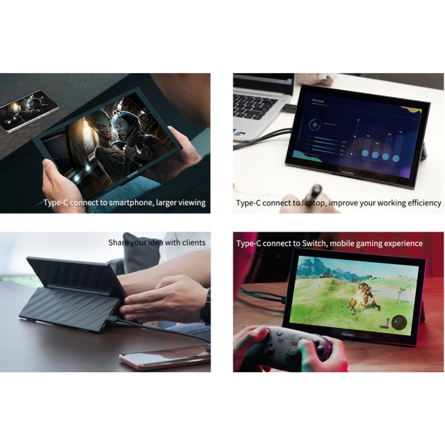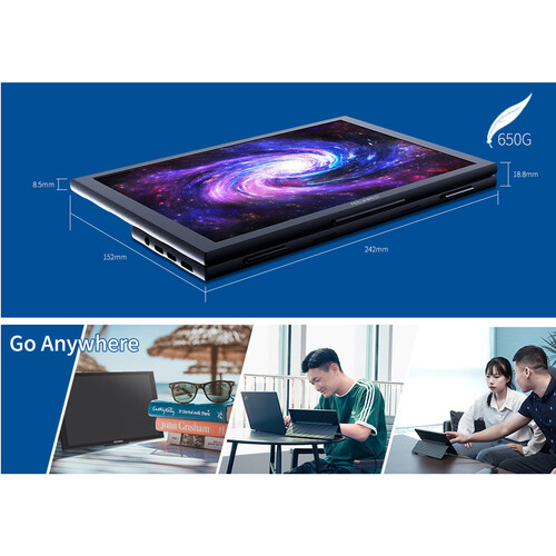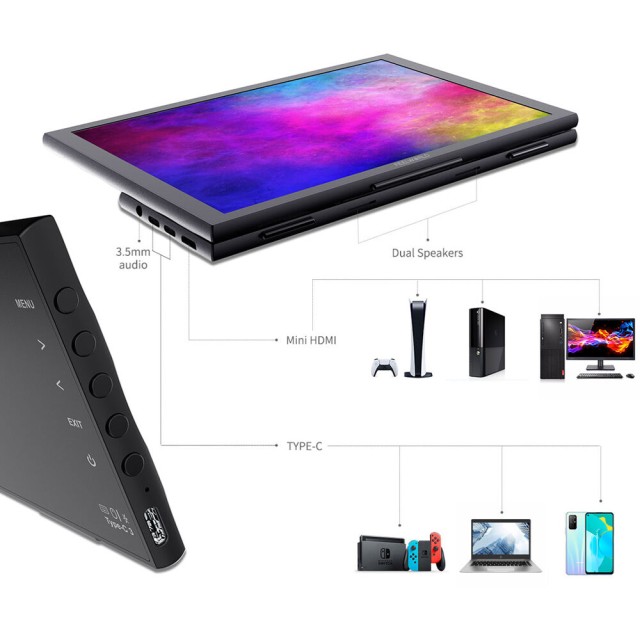 Prijenosni 10,1" monitor osjetljiv na dodir DH101 osigurava maksimalnu udobnost u pokretu, bilo da radite ili se igrate s telefonima, tabletima i prijenosnim računalima. Monitor je opremljen IPS panelom rezolucije 1280x800, kontrasta 900:1, kutova gledanja od 160° i svjetline od 280 cd/m 2 , kao i Mini-HDMI ulazom i parom USB-a. C priključci za povezivanje video izvora, napajanja, miša ili tipkovnice. Udobnost korisnika dodatno je poboljšana integriranim podesivim (0° - 90°) postoljem, ugrađenim zvučnicima i 3,5 mm izlazom za slušalice. Sve to uz težinu od samo 0,65 kg! DH101 također podržava kontrolu dodirom (putem USB-C) na kompatibilnim telefonima, tabletima i prijenosnim računalima.