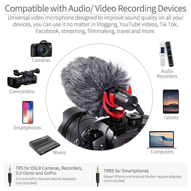Univerzalna kompatibilnost - Kompatibilno s uređajima za snimanje zvuka/videozapisa. TRS za DSLR fotoaparate, snimače, DJI Osmo i GoPro kamere (DJI i GoPro uređaji zahtijevaju adaptere (nisu uključeni)). TRRS za pametne telefone (noviji iPhone i Android modeli zahtijevaju adaptere (nisu uključeni)).