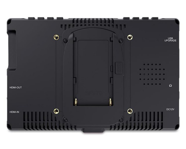 ...omogućuju gumbe na gornjem rubu zaslona, uključujući one funkcionalne, kojima se može dodijeliti bilo koja funkcija, npr. pomoć pri fokusiranju, prikaz u lažnim bojama itd. Donji rub sadrži standardni navoj 1/4"-20 za montaža monitora u DSLR/DSLM/kamere ili izravno na kamere pomoću (uključene) redukcije za utičnicu za bljeskalicu, stražnja ploča također ima montažne navoje VESA standarda s razmakom od 75 mm.