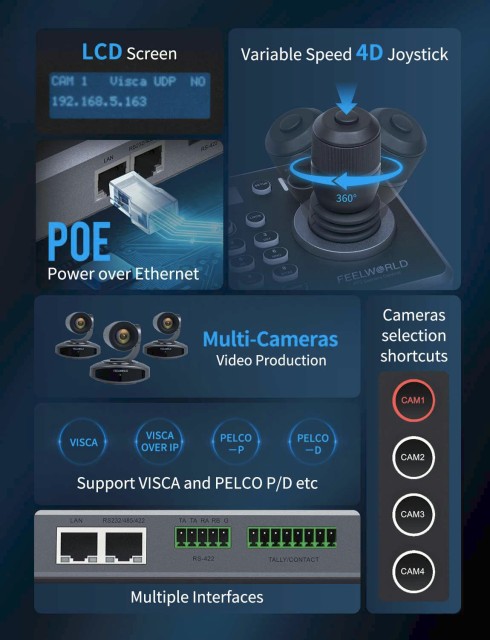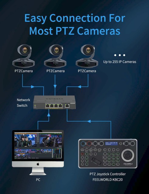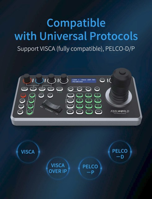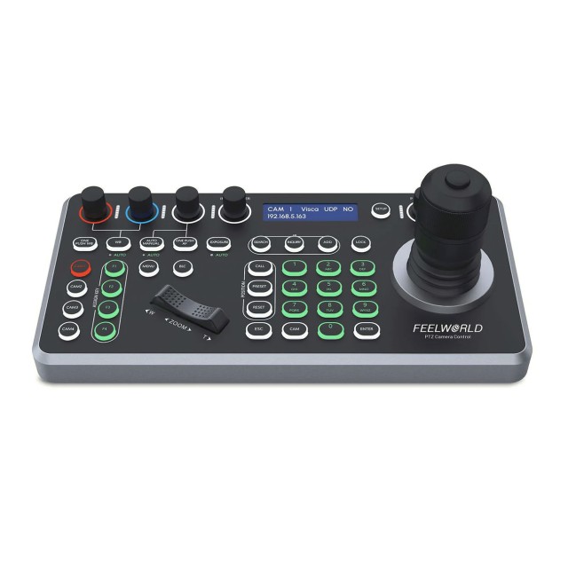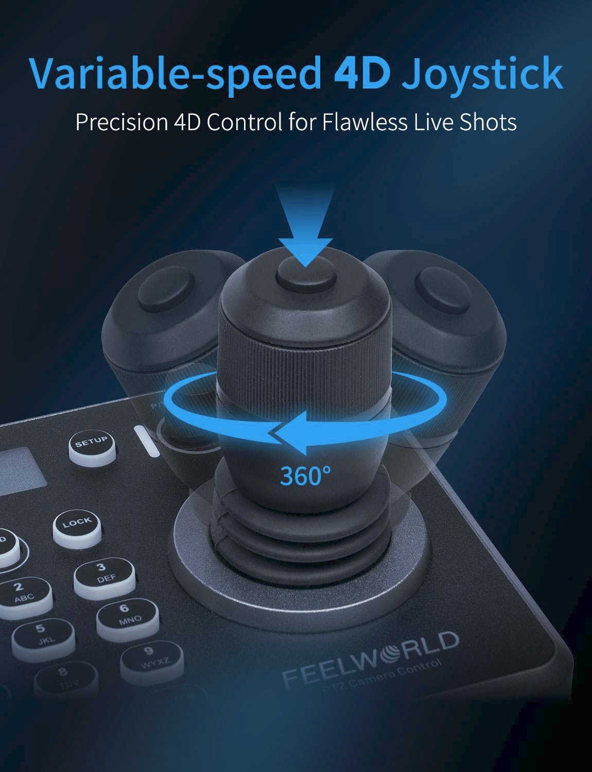 Feelworld KBC20 je profesionalni PTZ kontroler za kamere dizajniran za produkcije s više kamera, koji nudi precizno 4D upravljanje joystickom, podršku za više protokola, PoE napajanje i mogućnost upravljanja do 255 PTZ kamera za događaje uživo, konferencije, emitiranje i edukaciju.