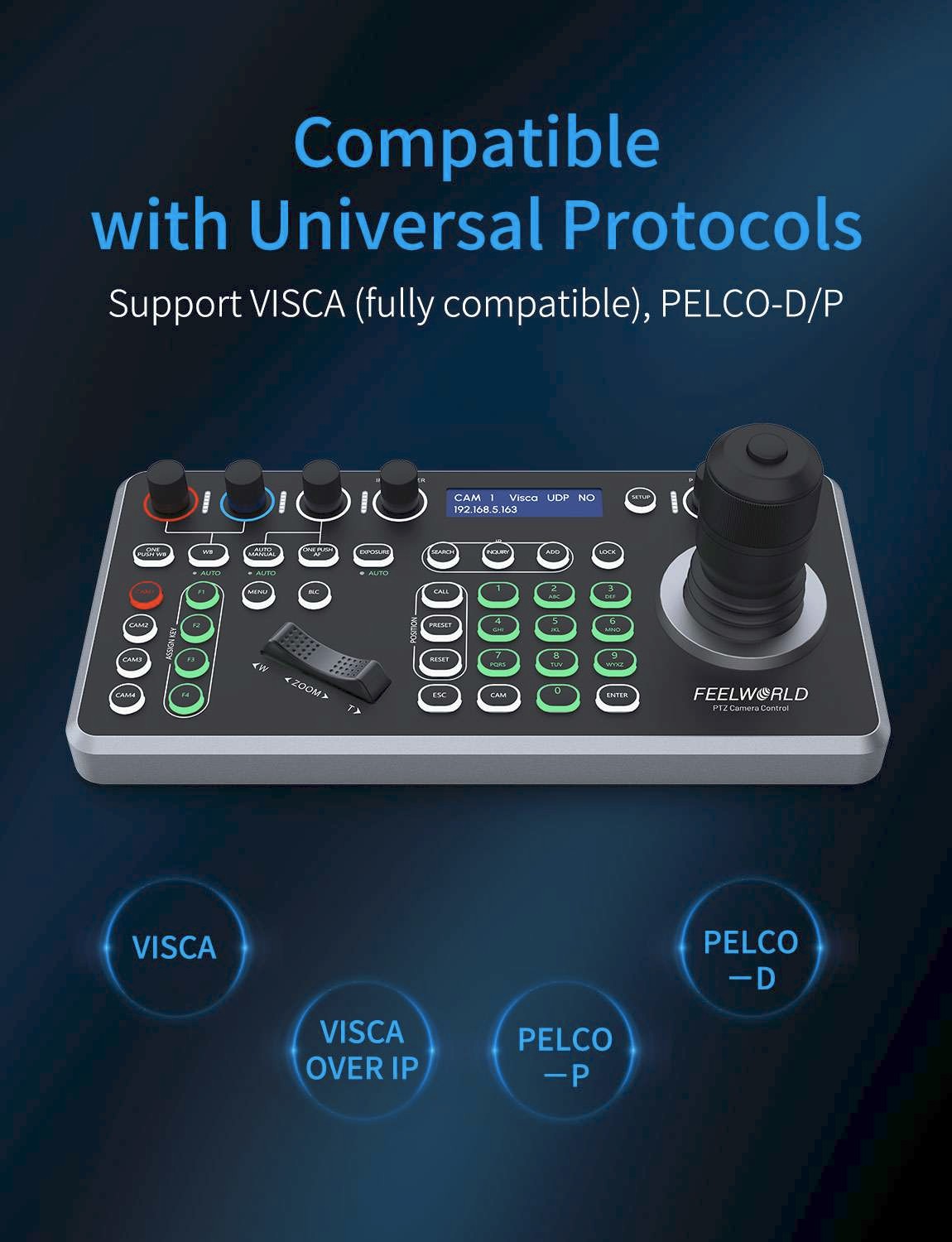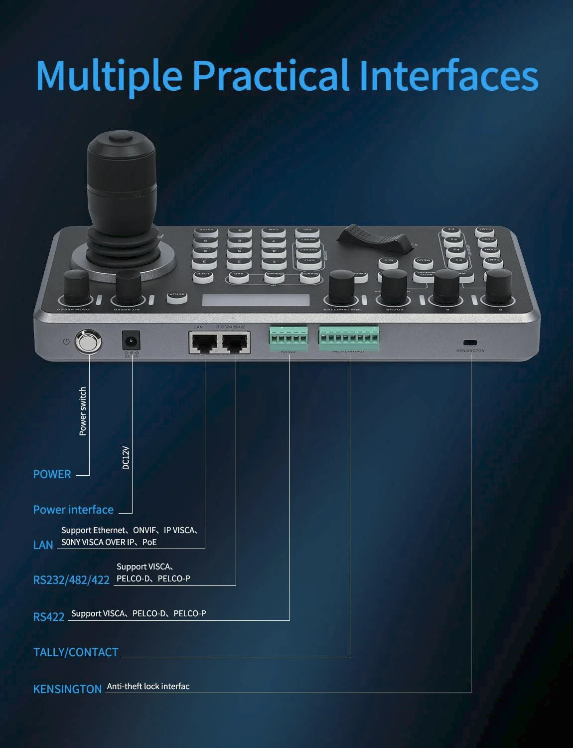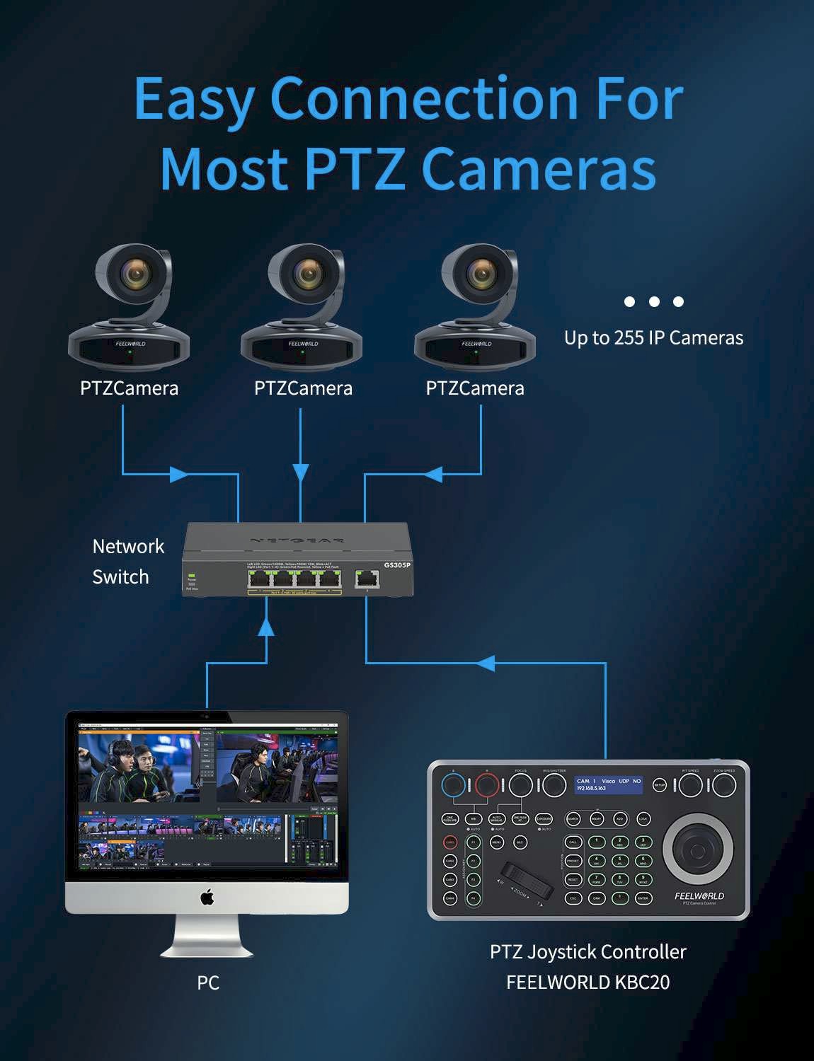 Podržavajući širok raspon kontrolnih protokola, uključujući ONVIF, IP VISCA, Sony VISCA, Pelco-D i Pelco-P, KBC20 se besprijekorno integrira s većinom PTZ kamera na tržištu. Može kontrolirati do 255 PTZ kamera putem IP ili serijskih veza, s brzim odabirom kamere pomoću numeričkih tipki i četiri namjenske tipke prečaca CAM1–CAM4 za trenutno prebacivanje između često korištenih kamera.