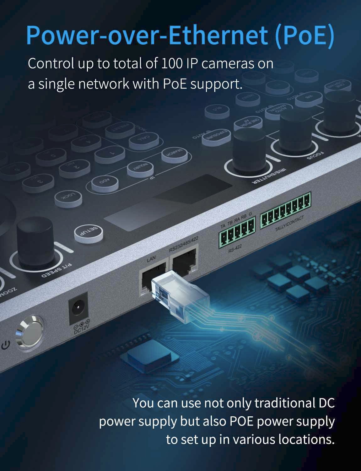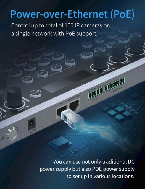 Za fleksibilnost instalacije, KBC20 nudi i mrežne (IP) i analogne načine upravljanja, s profesionalnim sučeljima uključujući RJ45 Ethernet, RS232/RS422/RS485, TALLY/kontaktne terminale i Kensington sigurnosni utor. Napajanje se može napajati putem PoE-a, što smanjuje nered kabela i omogućuje postavljanje jednog kabela do 100 metara kada se koristi s IEEE 802.3af/at kompatibilnim preklopnikom. Osim toga, web-bazirana konfiguracija omogućuje jednostavno otkrivanje kamere, postavljanje mreže, nadogradnje firmvera i upravljanje korisnicima.