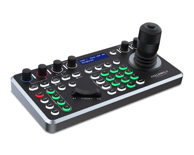 Feelworld KBC20N je svestrani kontroler PTZ kamere dizajniran za produkcije videa uživo, emitirajuće studije i AV instalacije. Podržava više protokola mrežnog upravljanja, uključujući NDI, ONVIF, IP VISCA, VISCA, Pelco-D i Pelco-P, što ga čini kompatibilnim s gotovo svakom PTZ kamerom na tržištu. Integrirani LCD zaslon pruža ažuriranja statusa u stvarnom vremenu za povezane kamere, osiguravajući da operateri mogu učinkovito pratiti i kontrolirati više kamera.