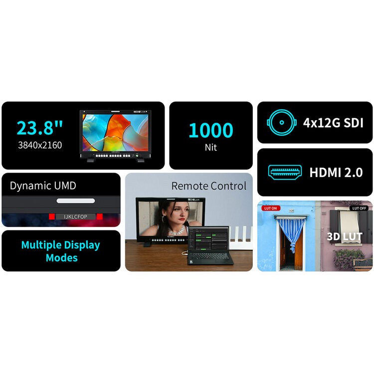 FeelWorld S24 je kompaktan, visokoučinkovit 23,8-inčni UHD 4K monitor dizajniran za profesionalnu video produkciju, emitiranje i postprodukciju. Njegov IPS LCD panel rezolucije 3840 × 2160 pruža svjetlinu od 1000 cd/m², omjer kontrasta od 1300:1 i široki raspon boja od 98,7% DCI-P3 za preciznu i živopisnu reprodukciju slike. Dizajniran za postavke s više kamera, monitor podržava četiri 12G-SDI ulaza i izlaza za UHD 4K60 i quad-link 8K, zajedno s HDMI I/O za DCI 4K60.