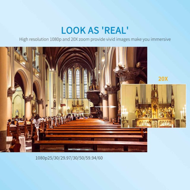 Visoka rezolucija 1080P@60 sličica u sekundi, izvrsna reprodukcija boja, 20x zum pružaju prvoklasnu optiku i realističan video, stvarajući doživljaj kao da sjedite zajedno u istoj prostoriji, čak i ako ste tisućama kilometara daleko.