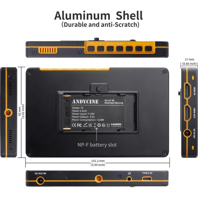 Andycine T6 je monitor na kameri sa 6" 1920x1080 zaslonom, izdržljivim aluminijskim kućištem i 4K HDMI I/O s 3D LUT izlazom.