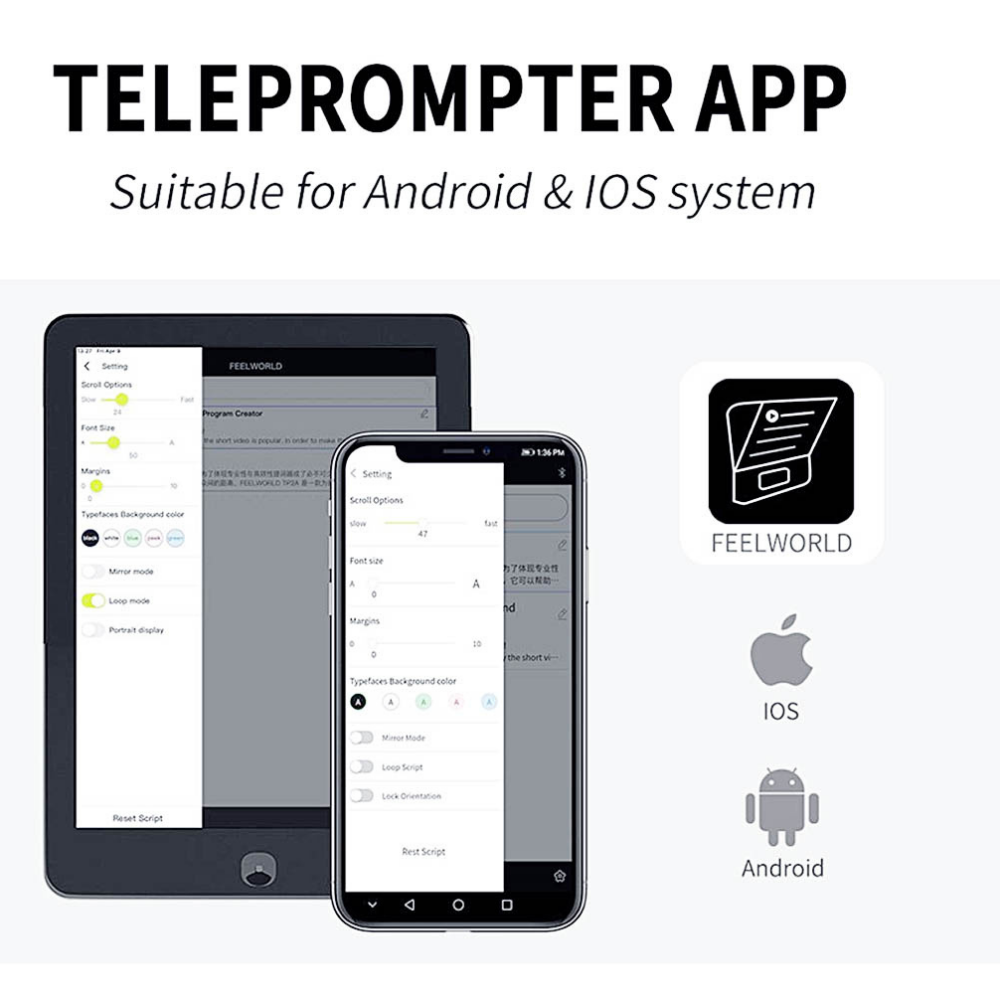 Univerzalni uređaj za čitanje Feelworld TP13 podržava prikaz teksta s gotovo svim telefonima/tabletima (do 11") i snimanje s telefonima i DSLR/DSLM zahvaljujući dobro promišljenom dizajnu stezne čahure i držaču kamere podesivom po visini (raspon do 6 cm). Također nudi uklonjivu svjetlosnu zavjesu od tkanine, prstenove od pjene i Bluetooth daljinski upravljač koji komunicira s isporučenom Android/iOS aplikacijom.