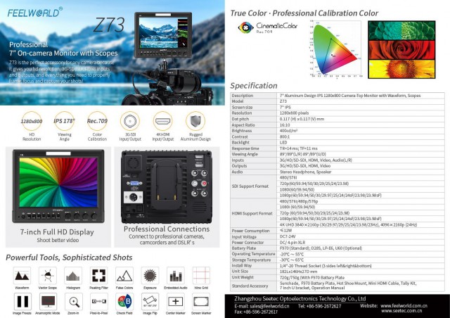 Iznimno izdržljivi 7" monitor kamere Z73 opremljen je visokokvalitetnim panelom rezolucije 1280x800, širokim kutom gledanja od 178°, omjerom kontrasta od 800:1 i svjetlinom od 400 cd/m2. Zaslon je kalibriran od strane proizvođača (HD standard Rec.709), a elektronika/softver monitora jamči prirodnu reprodukciju boja. Širok raspon sučelja (4K HDMI/Loop, 3G-SDI, A/V, stereo izlaz za slušalice, integrirani zvučnik) predodređuje ga za korištenje s profesionalnim fotoaparatima, DSLR/DSLM i modelima za profesionalne korisnike.