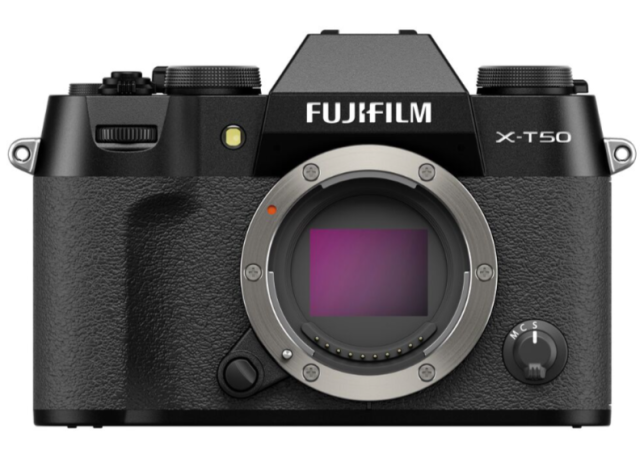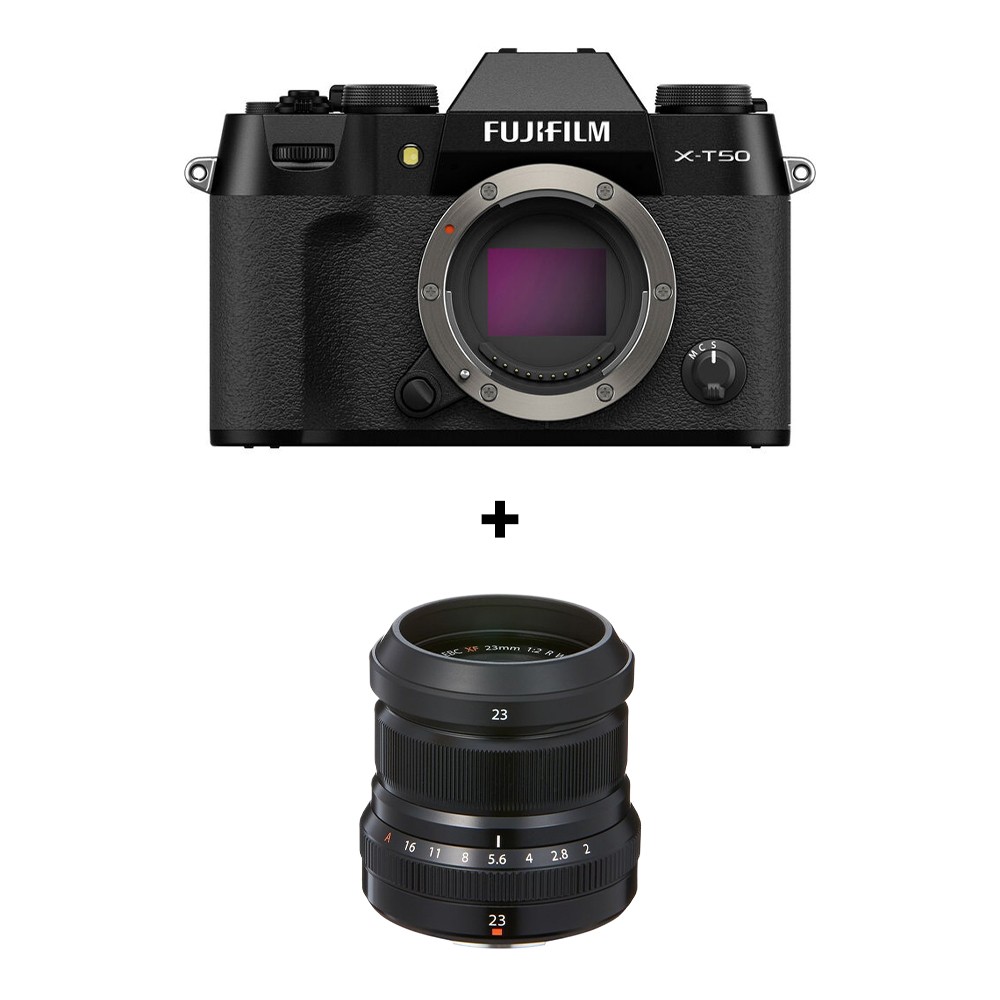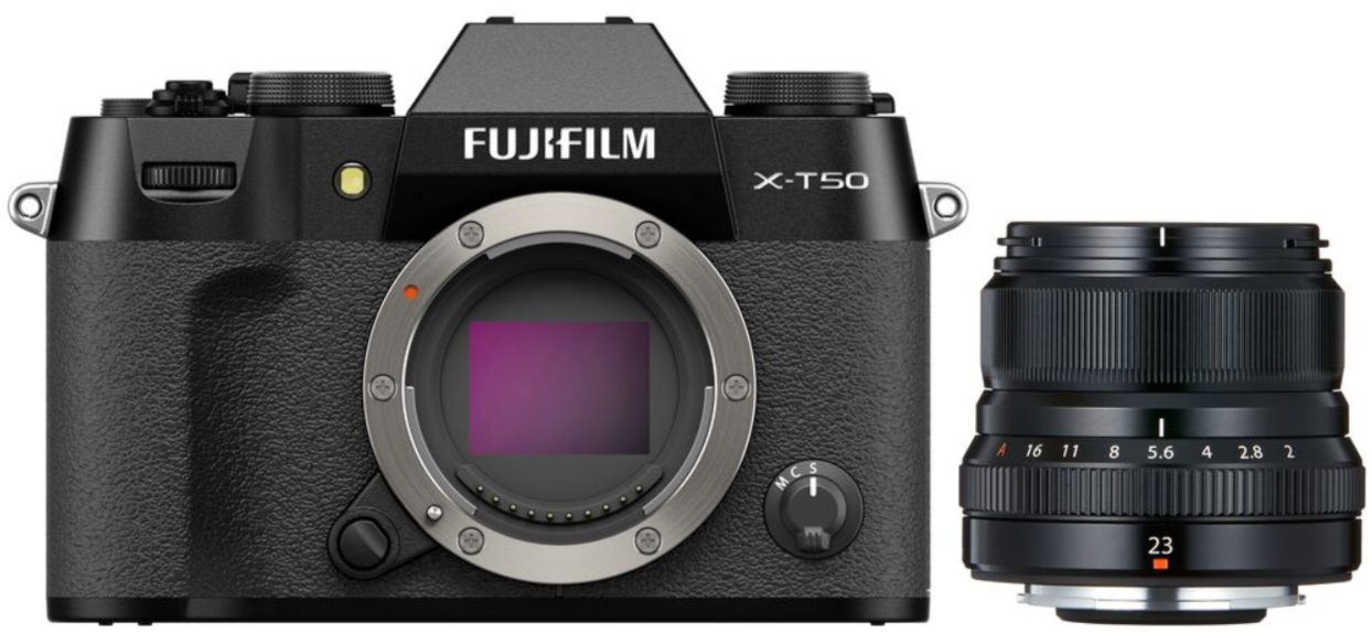 Fujifilm X-T50 Black je lagani APS-C fotoaparat bez zrcala inspiriran daljinomjerom (123,8 x 84 x 48,8 mm, 438 g s baterijom/SD karticom) opremljen 23,5 x 15,6 mm, 40,2 MP X-Trans CMOS 5 HR senzorom i X-Processorom 5, koji omogućuje snimanje 14-bitnih RAW slika rezolucije 7728 x 5152, izvornim ISO 125-12 800 (ekst. 64-51 200) i ultrabrzim elektroničkim brzinama zatvarača do 1/180 000 s za preciznu kontrolu ekspozicije. Značajke videa uključuju 6.2K/30p open-gate 3:2 (200 Mbps, 10-bitni H.265), 4K/60p i FHD/240p usporeno snimanje s potpunim očitavanjem senzora, uz podršku Digital IS + IS Boost za stabilnost iz ruke. Hibridni fazno/kontrastni AF sustav s 425 točaka radi do -7EV s dubokim učenjem umjetne inteligencije, prepoznavanjem objekta (ljudi, životinje, ptice, vozila, zrakoplovi, kukci, dronovi) i praćenjem. Namjenski kotačić za simulaciju filma na gornjoj ploči omogućuje trenutni pristup 20 načina rada, uključujući REALA ACE i Nostalgic Neg., s tri prilagođena utora; AUTO način rada automatski odabire postavke pomoću prepoznavanja objekta. 5-osni IBIS nudi do 7 stupnjeva kompenzacije (CIPA, nagib/skretanje s XF35mm f/1.4), dok 0,39" OLED EVF s 2,36 milijuna točaka (uvećanje od 0,62x, 100 fps) i 3" zaslon osjetljiv na dodir s promjenjivim kutom od 1,84 milijuna točaka (automatsko fokusiranje/upravljanje dodirom) olakšavaju kreativne kutove. Povezivost uključuje USB-C 10 Gbps (punjenje/podaci), micro-HDMI (12-bitni RAW izlaz), Wi-Fi 4, Bluetooth 5.2 i 2,5 mm priključak za mikrofon/daljinski upravljač; pohranu omogućuju dva UHS-II SD utora. Ugrađena bljeskalica (GN 5) i TTL papučica za bljeskalicu podržavaju vanjsko osvjetljenje. Baterija NP-W126S omogućuje ~305 snimaka (CIPA LCD). U kombinaciji s objektivom XF 23mm f/2.0 R WR, čini svestran komplet za uličnu fotografiju s izdržljivom, brzom optikom.