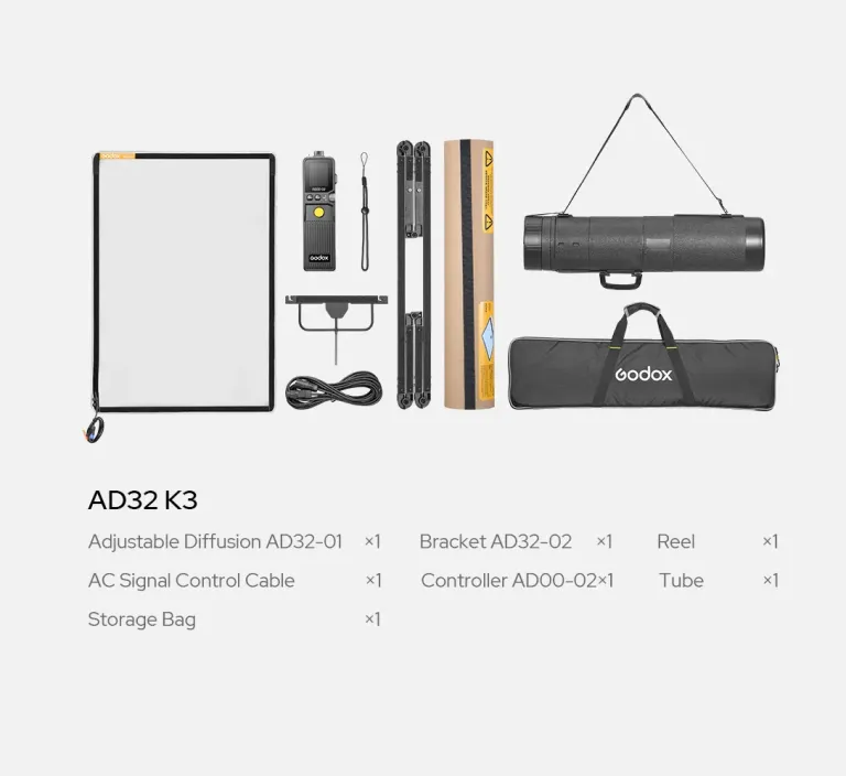 Godox Knowled AD32 K3 podesivi difuzor je profesionalni pribor za rasvjetu dizajniran za fleksibilnu i preciznu kontrolu nad difuzijom svjetlosti. Njegov potpuno sklopivi okvir čini ga vrlo prenosivim za snimanja na lokaciji, dok motorizirani sustav difuzije omogućuje dinamička podešavanja kako bi odgovarao kreativnim potrebama rasvjete. Komplet nudi dva načina podešavanja: način rada Level za vizualiziranu kontrolu difuzije od 0–100% i način rada Light Reduction za fino podešavanje svjetlosnog izlaza između -0,1 i -2,0 EV.