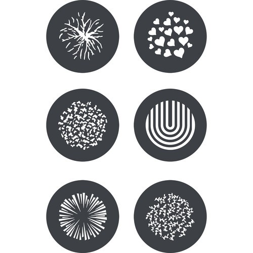 Poboljšajte svoj Godox MG1200Bi reflektor s GP-GS2 Gobo setom , koji sadrži šest čeličnih goboa koji projiciraju kreativne uzorke poput vatrometa, sunčevih bljeskova, srca i još mnogo toga - savršeno za kazalište, film, modu i scenske efekte.