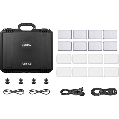 Godox Knowled C5R-K8 RGBWW kreativni komplet baterija za žarulje je prijenosno LED rješenje s 8 svjetala dizajnirano za fotografe i snimatelje koji traže svestranu, visokokvalitetnu rasvjetu. Svako svjetlo nudi podesivu temperaturu boje od 2500–8500K, zatamnjenje od 0–100%, 39 kreativnih efekata i može se kontrolirati putem ugrađenog LCD zaslona ili Bluetooth aplikacije. Priložena kutijica za punjenje pohranjuje, napaja i prenosi svih osam svjetala za praktično korištenje u pokretu.