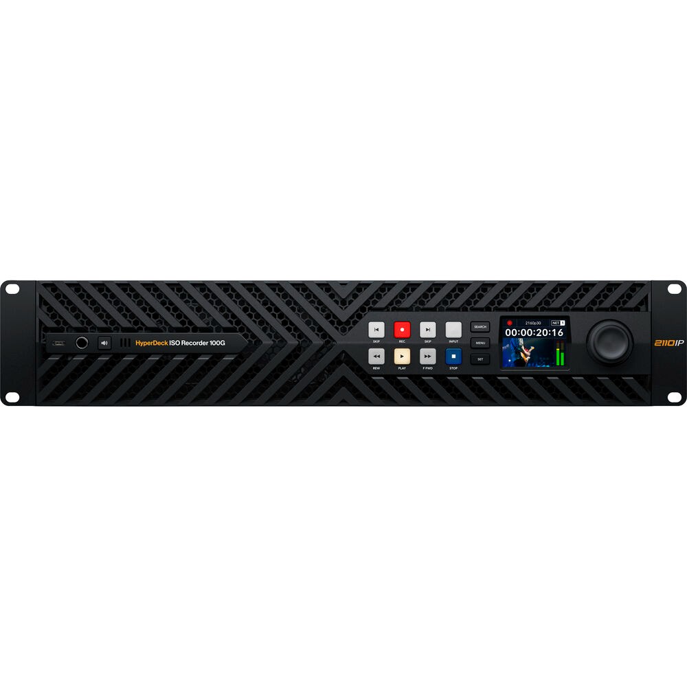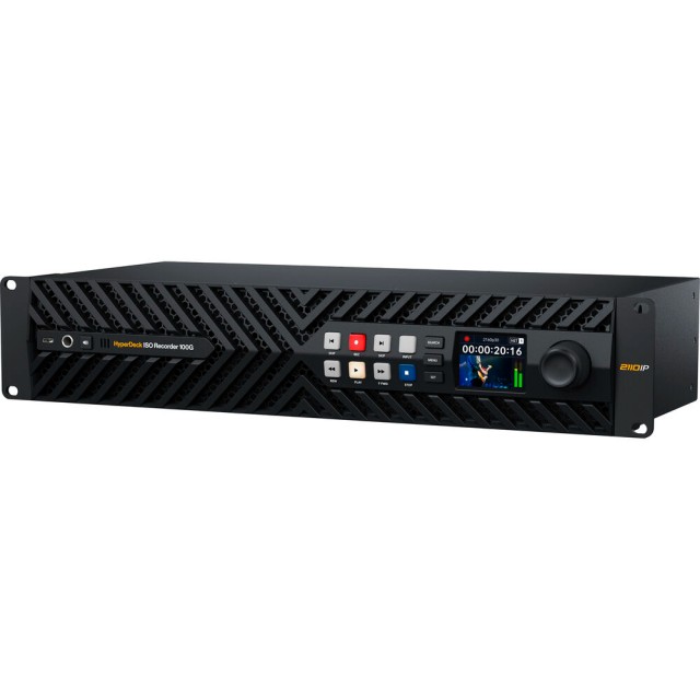 Blackmagic Design HyperDeck ISO Recorder 100G je 2RU SMPTE 2110 snimač za emitiranje, dizajniran za produkciju uživo s više kamera i IP radne procese visokog protoka. Omogućuje snimanje do osam kanala 10-bitnog 4:2:2 videozapisa u rezolucijama do DCI 4K60, pri čemu se svaki ulaz sprema kao zasebna ProRes datoteka izravno na mrežnu pohranu putem dvostrukih 100 GbE veza. Redundancija prema standardu SMPTE ST 2022-7 osigurava neprekidno snimanje putem dva mrežna puta, dok podrška za 16 kanala ugrađenog zvuka po streamu očuvava potpunu integritet višekanalnog zvuka za postprodukciju.