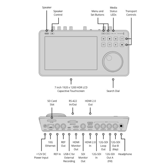 Ovaj novi live media player i glavni snimač ima ergonomske fizičke upravljačke tipke koje vam omogućuju kretanje kroz širok raspon medija i reprodukciju isječaka. Veliki HDR zaslon od 7 inča ima gumbe za reprodukciju, pauzu i snimanje, kao i mini vremensku traku reprodukcije koja vam pomaže u kretanju kroz vaše isječke. Također je uključen "HUD" (heads-up zaslon) koji prikazuje važne informacije kao što su vremenski kod, status medija i audio mjerači. Osim toga, možete aktivirati pune opsege emitiranja i uključiti značajke kao što su pomoć pri fokusiranju i histogram RGB ekspozicije na dodirnom zaslonu. Postavke HyperDeck Shuttle 4K Pro mogu se promijeniti izravno putem izbornika na ekranu. Osim toga, možete snimati i spremati 3D LUT-ove . Svijetli LCD zaslon ima širi raspon boja , tako da podržava Rec. 2020. i zap. 709 .