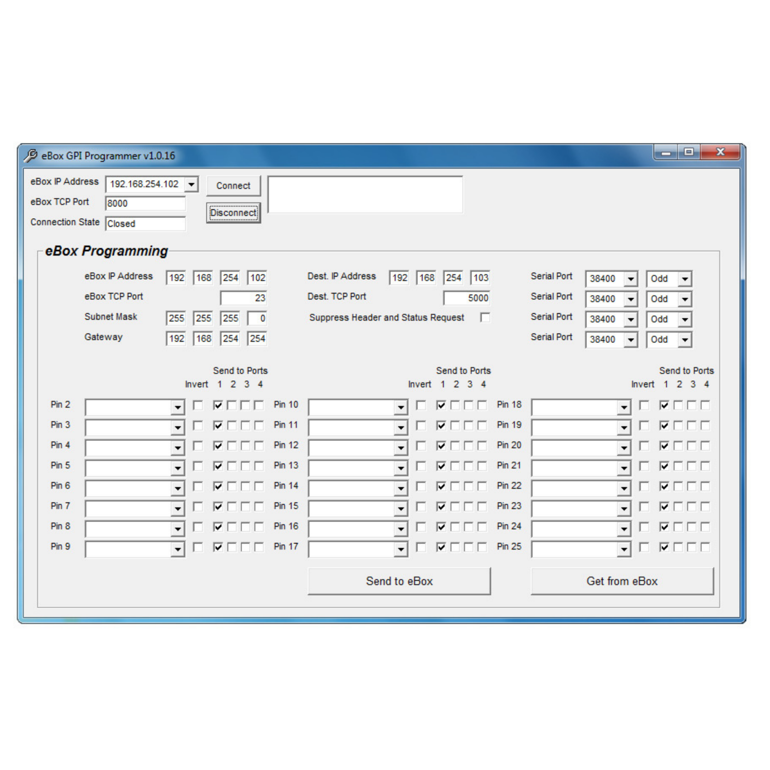 Smjer priključka može se konfigurirati kao DTE ili DCE na svakom priključku neovisno. Osim toga, eBOX može djelovati kao pretvarač GPI-a u serijski priključak ili GPI-a u Ethernet. U ovim načinima rada jedinica pretvara GPI ulazne okidače u ugrađene naredbe.