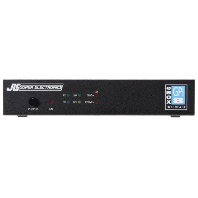 eBOX GPI8 Ethernet na GPI sučelje tvrtke JLCooper je Ethernet/GPI sučelje za korisnike koji trebaju GPI funkcionalnost, ali ne trebaju naprednu serijsku Ethernet vezu. Njegova druga prednost je što sadrži eBOX IO funkcije (s opto-izoliranim ulazima i relejnim izlazima) i kompatibilan je sa sBOX sustavom. EBOX GPI8 pojednostavljuje kabliranje na velike udaljenosti korištenjem IP adresabilne point-to-point arhitekture za slanje kontrolnih poruka preko postojećeg 10/100 BASE-T kabliranja. Idealan je za kontrolu prekidača, računalnih sustava, kamera, projektora i drugih GPI uređaja preko LAN-a, WAN-a i Interneta. Jedinica se preporučuje za televizijsko emitiranje, mreže za strujanje medija, objekte za uređivanje u više prostorija, produkciju vijesti ili u bilo kojem audio/video/multimedijskom studiju gdje se opremom treba upravljati daljinski ili putem weba.