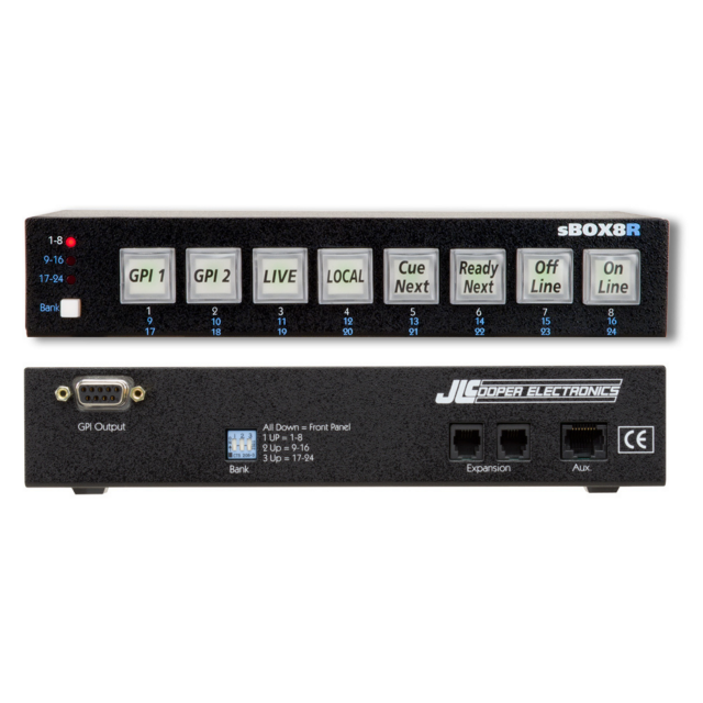 Verzija daljinskog okidača za gBox i eBox na stalku povezuje sBOX s gBOX-om (GPO Trigger Box) ili eBOX-om (Quad Serial/Ethernet/GPI Interface) kao jednostavan daljinski upravljač za pokretanje GPO događaja. Osim toga, možete koristiti eBOX za pokretanje slanja korisnički programiranih serijskih ili Ethernet poruka. Ovaj daljinski okidač ima 8 tipki s LED pozadinskim osvjetljenjem i prekidač banke s pozadinskim osvjetljenjem koji omogućuje da jedan daljinski okidač kontrolira do 24 GPO-a. Višestruke daljinske okidačke jedinice (do 3) mogu pružiti namjenske gumbe za do 24 GPO-a. Ova kompaktna jedinica može se postaviti iza tipkovnice vašeg računala.