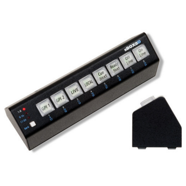 Desktop verzija Remote Trigger za gBox i eBox povezuje sBOX s gBOX-om (GPO Trigger Box) ili eBOX-om (Quad Serial/Ethernet/GPI Interface) kao jednostavnim daljinskim upravljačem za pokretanje GPO-ova. Osim toga, možete koristiti ovu jedinicu s eBOX-om za pokretanje slanja korisnički programiranih serijskih ili Ethernet poruka. Ovaj daljinski okidač ima 8 gumba s LED pozadinskim osvjetljenjem i prekidač banke s pozadinskim osvjetljenjem, što vam omogućuje kontrolu do 24 GPO-a s jednim sBOX8D daljinskim okidačem. Višestruke sBOX8D daljinske okidačke jedinice (do 3) mogu pružiti namjenske gumbe za do 24 GPO-a. Ova kompaktna jedinica može se postaviti iza tipkovnice vašeg računala.
