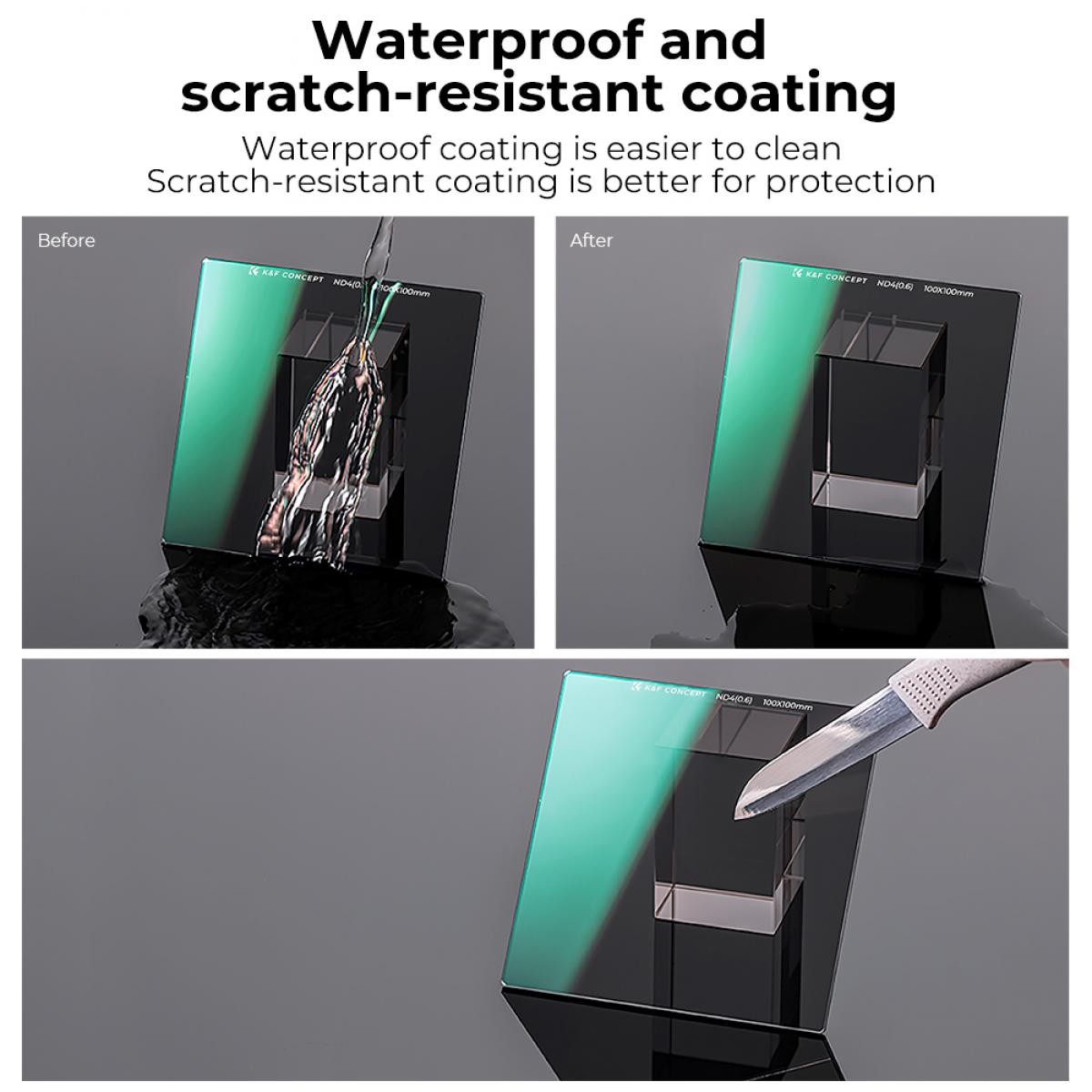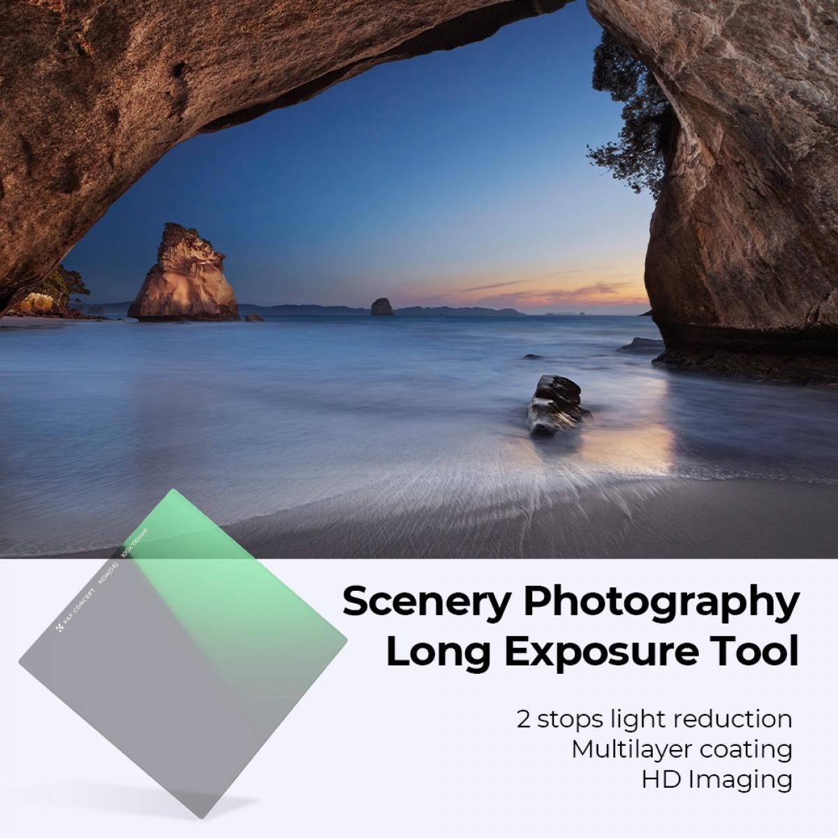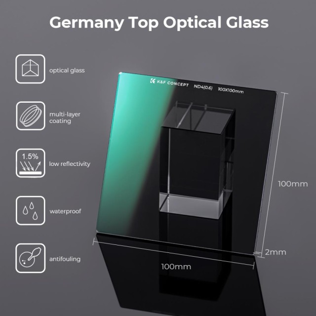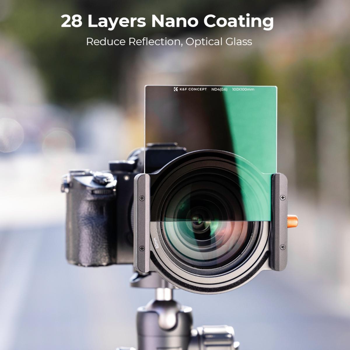 K&F Concept 100×100×2mm Nano-X Square Coated ND4 filter je precizno konstruirani filter neutralne gustoće dizajniran za dugu ekspoziciju i fotografiju visoke razlučivosti. Izrađen od vrhunskog AGC optičkog stakla s dvostranim 28-slojnim nano premazima, smanjuje odsjaj i refleksije, a istovremeno održava oštrinu na svim žarišnim duljinama. Njegova izdržljiva, vodootporna, otporna na ogrebotine i ulje površina osigurava pouzdane performanse u zahtjevnim okruženjima, a priložena zaštitna kožna i spužvasta futrola štiti filter tijekom transporta.