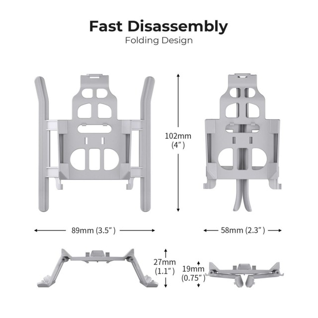Povišeni stajni trap povećava udaljenost između trupa drona i tla, pomažući u sprječavanju kontaminacije tijela prljavštinom, prašinom i krhotinama ili oštećenja gimbal i kamere tijekom polijetanja i slijetanja. Njegova lagana, ali čvrsta konstrukcija osigurava da ostane čvrsto pričvršćen bez utjecaja na performanse leta.