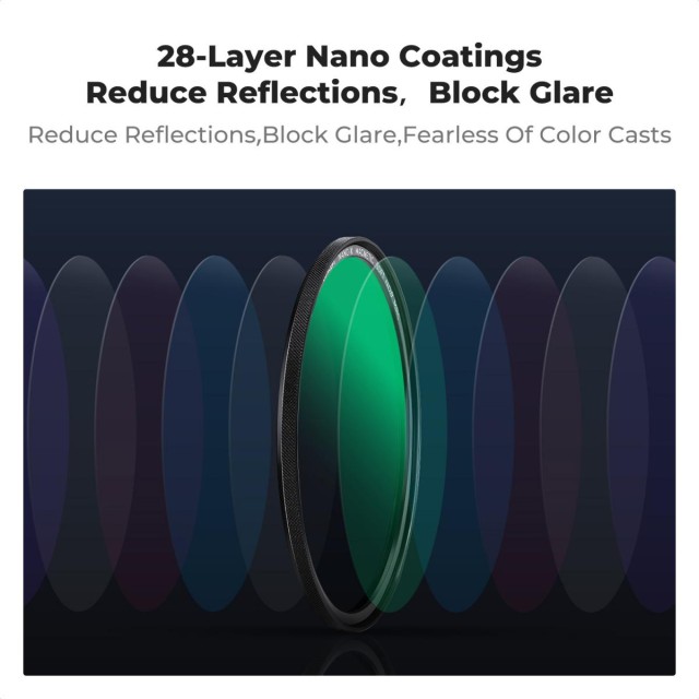 Svi filteri imaju uvezeno AGC optičko staklo visoke razlučivosti s 28-slojnim nano/višestrukim premazima, što nudi otpornost na ogrebotine, vodootpornost, otpornost na ulje i točnu reprodukciju boja. Ultra tanki CNC glodani okvir (1,9–3,33 mm) sprječava vinjetiranje na širokokutnim objektivima, a istovremeno osigurava glatku ugradnju i uklanjanje. Uključena je kompaktna vrećica za filter za sigurnu pohranu i prenosivost.