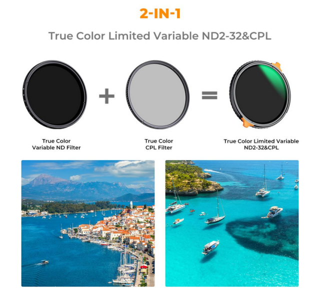 K&F 49MM višenamjenski True Color ND2-32 + CPL filtar kombinira prednosti filtara neutralne gustoće (ND) i kružnog polarizatora (CPL) u jednom komadu, što ga čini bitnim alatom za poboljšanje vaše fotografije. Ovaj svestrani filtar dizajniran je za kontrolu svjetla, smanjenje refleksije i očuvanje prave kvalitete boja na vašim slikama i videozapisima.