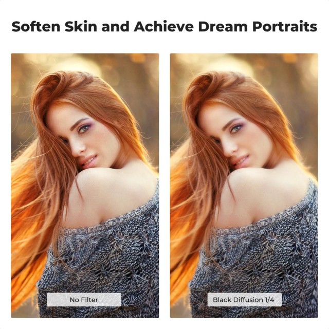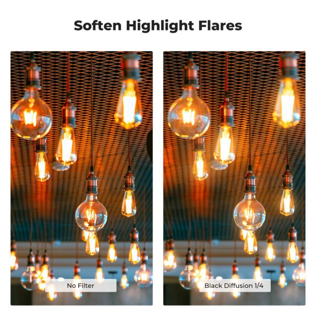 Black Cine Diffusion filter izrađen je od preciznog AGC optičkog stakla iz Japana, dvostruko višestruko premazanog za povećanje prijenosa svjetlosti do 84%, učinkovito smanjujući refleksije od glatkih površina i ne stvarajući vinjetiranje ili sjene.