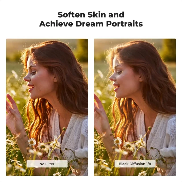 K&F Concept 1/8 crni difuzni filter omekšava svjetlo na slici ili videu i kontrolira istaknute dijelove, čineći kožu ili pore nježnijima, a tehnologija dvostranog poliranja osigurava visoku definiciju unutar žarišne duljine od 550 mm. Crni difuzni filter 1/8 Izrađen od japanskog AGC visokopreciznog optičkog stakla, višeslojni premaz za dodatnu transparentnost do 87% propusnosti, učinkovito smanjuje refleksiju koja dolazi od samog filtera.