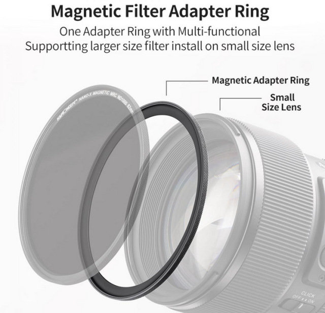 Magnetski adapterski prsten K&F 55-82 mm omogućuje korištenje većih filtera na lećama s manjim veličinama navoja, nudeći svestranost i jednostavnost upotrebe.
