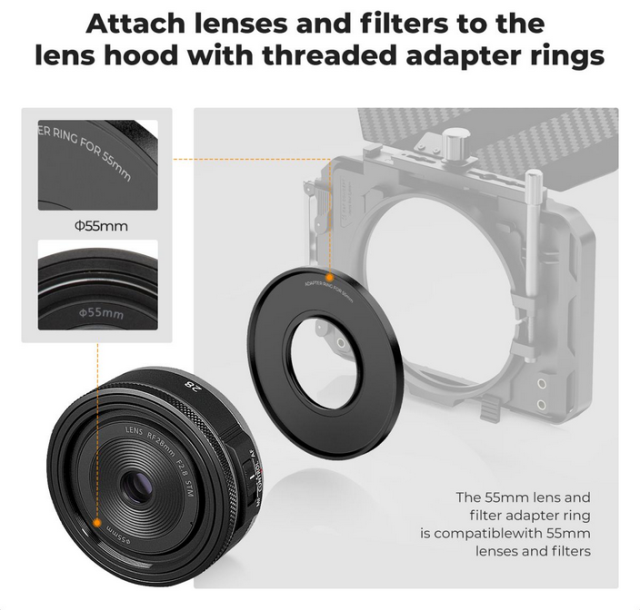 K&F Concept 55mm Matte Box Adapter Ring izrađen je od aluminijske legure zrakoplovne kvalitete, nudeći savršenu ravnotežu izdržljivosti i male težine. Dizajniran za korištenje s K&F Concept mat kutijama, ovaj adapter osigurava precizno, svjetlosno pristajanje kako bi poboljšao vaše iskustvo snimanja.
