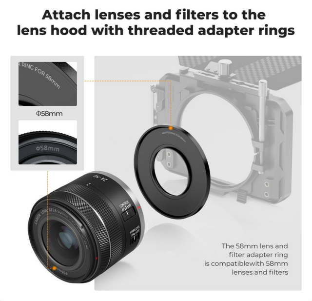 K&F 58 mm Matte Box adapterski prsten, izrađen od aluminijske legure zrakoplovne kvalitete, osigurava izdržljivost, stabilnost i precizno pristajanje za K&F Concept mat kutije, poboljšavajući kvalitetu snimanja s lakoćom.