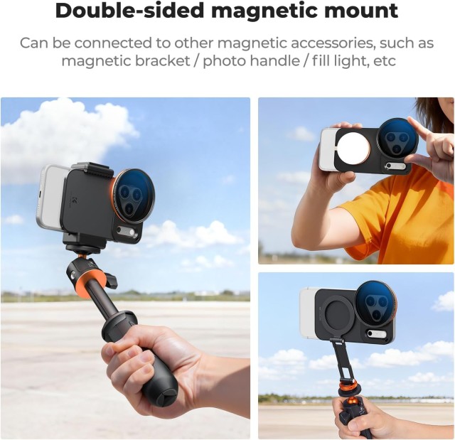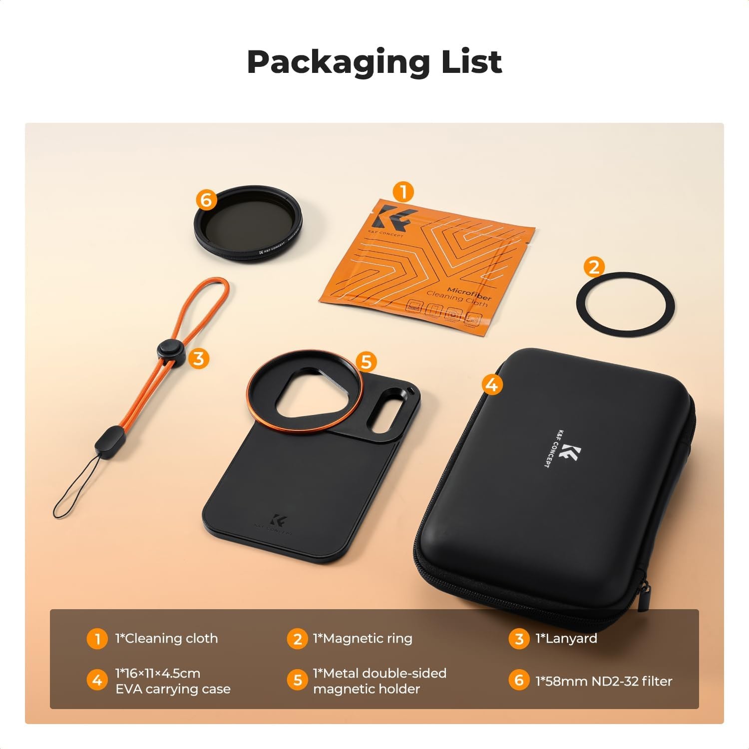 K&F 58 mm držač za iPhone Magsafe dvostrani magnetski filter s uvrtanjem za iPhone 17 Pro Max pruža precizno pristajanje, snažne dvostrane magnete i podržava 58 mm filtere, uključujući priloženi VND filter. Osigurava stabilno, sigurno i svestrano mobilno fotografiranje uz sveobuhvatnu zaštitu i prijenosnu pohranu.