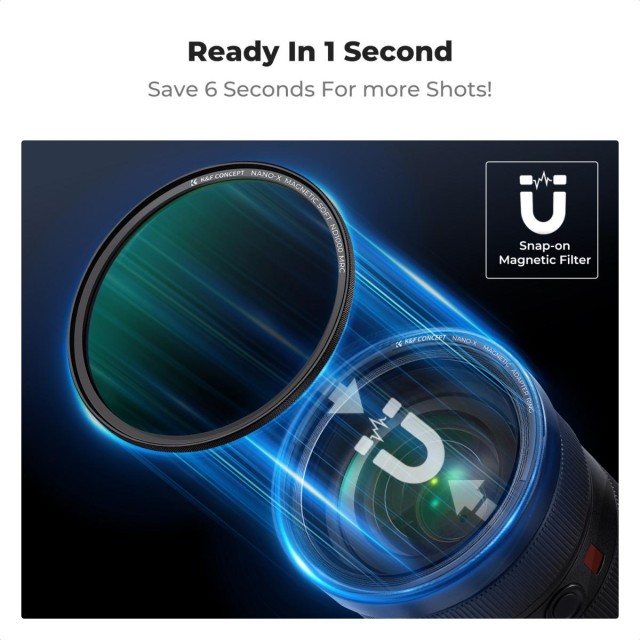 K&F Concept 62mm magnetski set od 5 filtera uključuje GND8, ND8, ND64 i ND1000 filtere plus magnetski adapter prsten, koji nudi trenutnu zamjenu od 1 sekunde, vrhunsko višeslojno AGC optičko staklo i ultra tanki dizajn bez vinjeta, savršen za pejzažnu i fotografiju s dugom ekspozicijom.