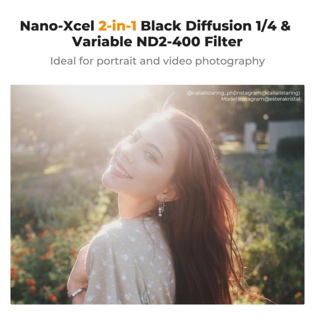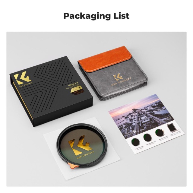 K&F Concept 62 mm višenamjenski podesivi filter Black Mist 1/4 i varijabilni ND2–ND400 visokoučinkoviti je 2-u-1 alat za fotografiju i video. Spaja meke, sjajne detalje i smanjeni kontrast difuzijskog filtera Black Mist 1/4 s fleksibilnom kontrolom ekspozicije varijabilnog ND filtera, podesivog od ND2 do ND400. Sustav podešavanja u obliku palice omogućuje preciznu kontrolu zaustavljanja i rotaciju od 360°, što omogućuje jednostavno podešavanje ekspozicije u stvarnom vremenu za video ili kreativnu fotografiju. Izrađen od uvezenog AGC optičkog stakla s 28 slojeva dvostranih nano premaza, filter pruža jasnoću visoke razlučivosti, a istovremeno ostaje vodootporan, otporan na ogrebotine, ulje i plijesan. Tehnologija samozaključavanja okvira tvrtke K&F Concept eliminira križni uzorak "X" uobičajen kod konvencionalnih varijabilnih ND filtera, čak i na širokokutnim objektivima. Ovaj filter je savršen za filmske video zapise, portretnu fotografiju, pejzaže i kreativne scenarije snimanja koji zahtijevaju i difuznu i varijabilnu ND kontrolu.