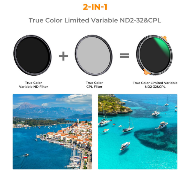 K&F 62 mm višenamjenski True Colour ND2~32+CPL filter kombinira prednosti ND i CPL filtera u jednoj jedinici. Ovaj vam filtar omogućuje kontrolu unosa svjetla, smanjenje refleksije od nemetalnih površina i poboljšanje boje i kontrasta u vašim snimkama. Sadrži napredni okvir sa samozaključavanjem koji se rotira beskonačno između 1 i 5 koraka (ND2-32) kako bi se izbjegli neželjeni križni uzorci. Izrađen od uvezenog AGC optičkog stakla s 28-slojnim premazom, ovaj je filtar vodootporan, otporan na ogrebotine i daje slike visoke razlučivosti s pravom točnošću boja.