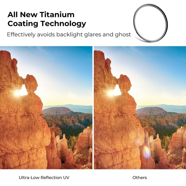 UV filtr s velmi nízkou odrazivostí. Společnost K&F Concept používá u UV filtru s velmi nízkou odrazivostí titanovou povrchovou úpravu, která snižuje odrazivost povrchu filtru na 0,1 %, což zlepšuje přenos světla, účinně zabraňuje odleskům a duchům v protisvětle a zajišťuje bezchybnou ostrost.