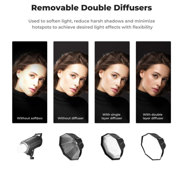 - Saćasta mreža i difuzori: Saćasta mreža koncentrira i kontrolira smjer svjetla, obogaćujući razine svjetla i tame u vašim snimkama i stvarajući dramatične, izražajne svjetlosne efekte. Dva visokokvalitetna difuzora mogu se koristiti zajedno ili odvojeno za stvaranje različitih stilova rasvjete.